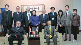 写真左から:通訳ミヒャエラさん、プロッメガーゼネラルマネージャー、長田正太郎監事、武田紀念男理事、藤井玲南さん、奥田吉郎理事、川手正一郎常務理事、ウィンマー最高執行責任者、鳩山邦夫理事長、ツィムブルグ在日オーストリア大使、サイヤー労使協議会副議長、木村正治理事、フィッシャー理事、(事務局:羽中田・井之輪)